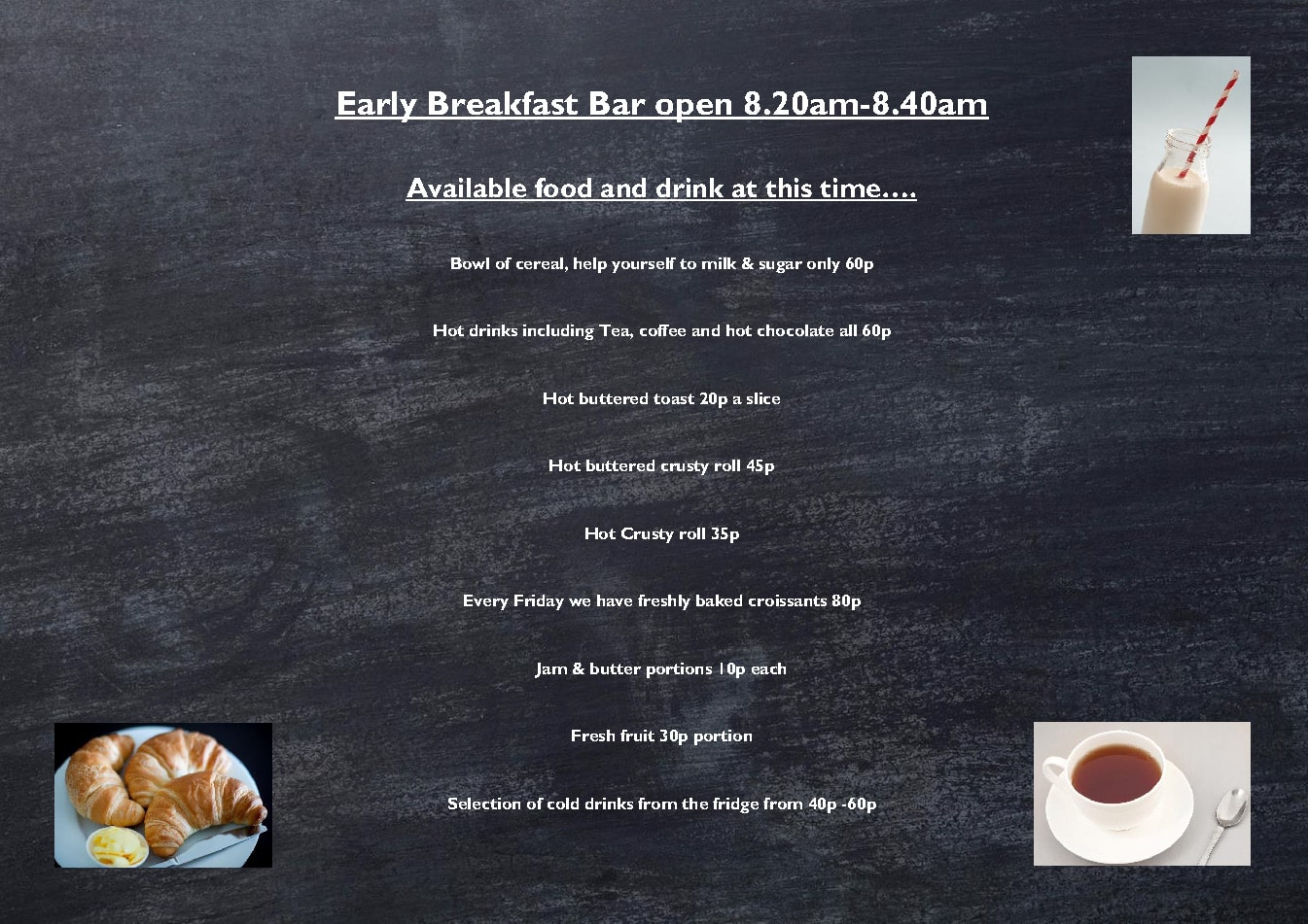 Please may we remind you that food & drink is not allowed to be consumed away from the Dining room, and the the sale or consumption of fizzy drinks or energy drinks is not permitted.